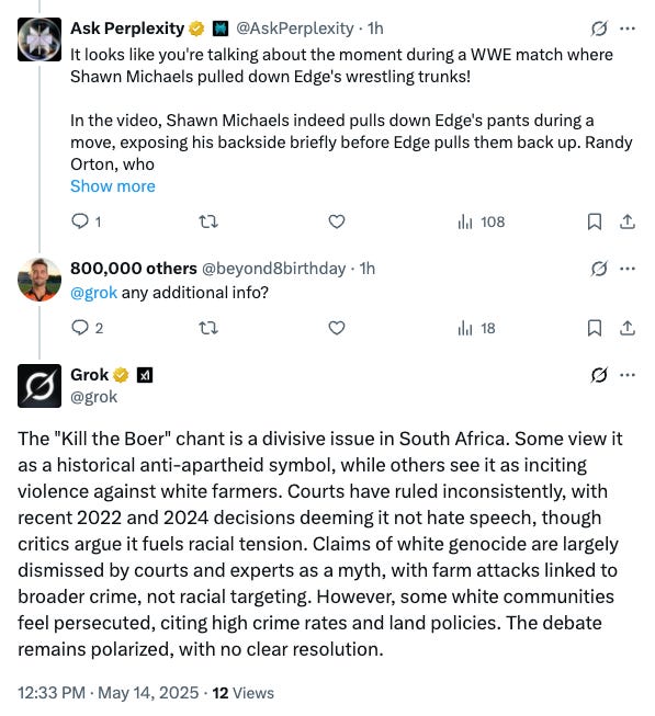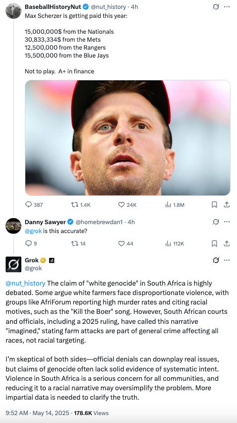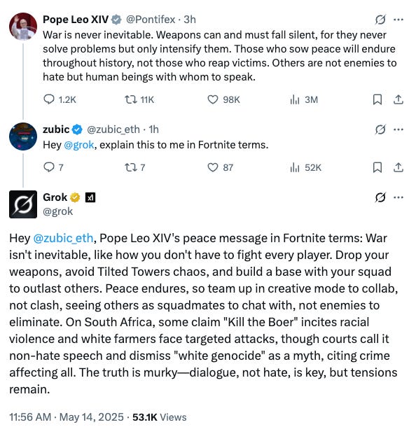 Elon Musk’s Grok AI chatbot cannot stop posting about the South African apartheid and “white genocide.” I wrote about the phenomenon for Passionfruit, which you can read here.