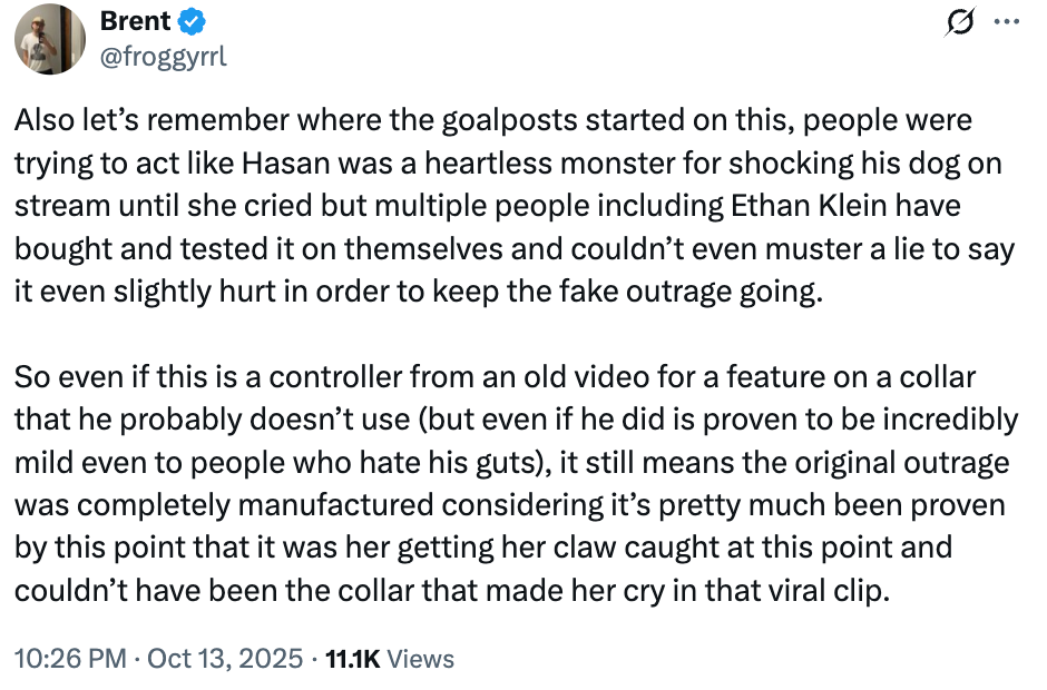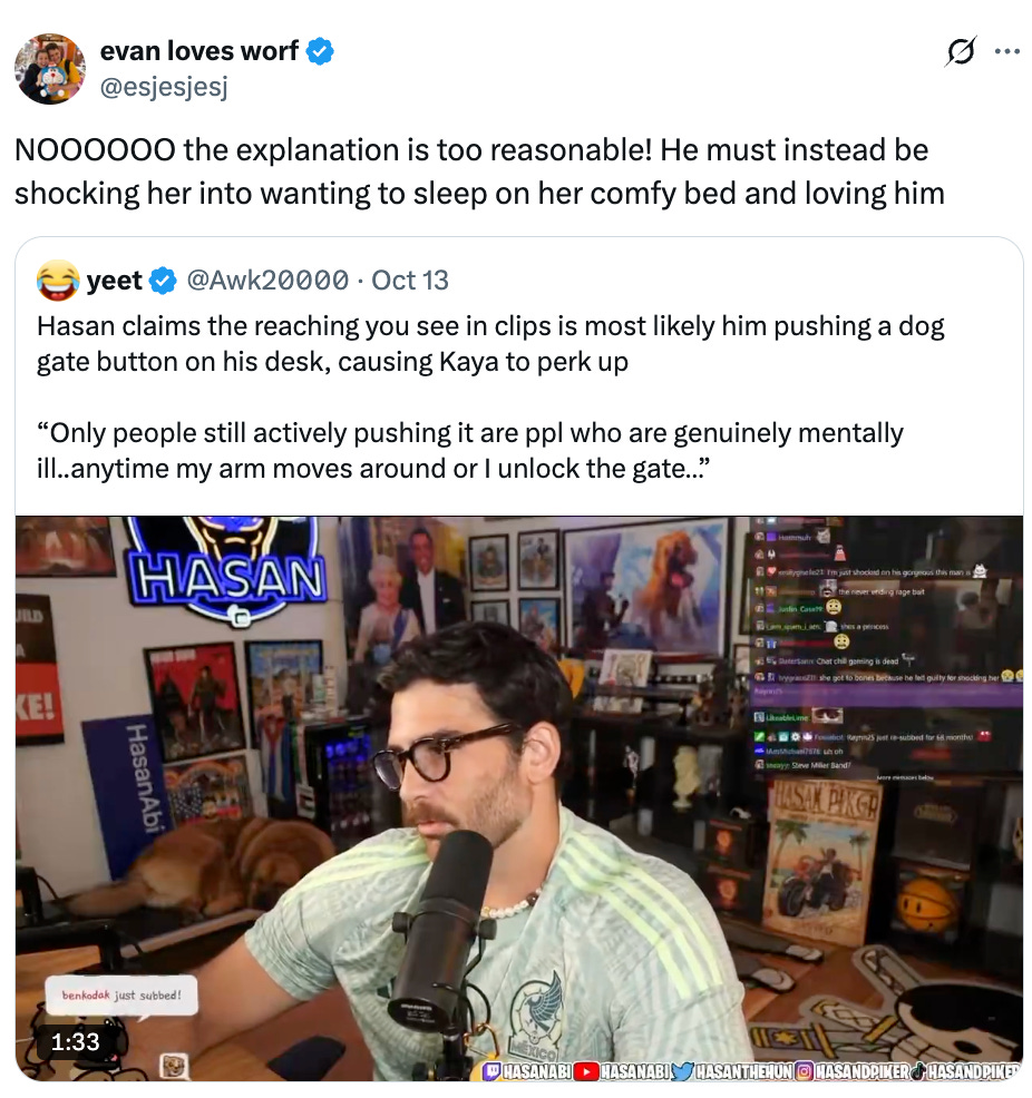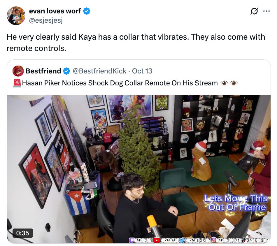 I’ve met Kaya IRL. I have never seen her in a shock collar. I have spoken to people who have walked Kaya, babysat Kaya, spent probably hundreds of hours with this dog, according to everyone I spoke to, in zero instances has she ever been shocked or abused. Not a single guest on Piker’s Twitch stream, in the years and years that he’s had Kaya, has said that they’ve ever seen Piker mistreat Kaya.