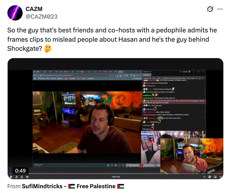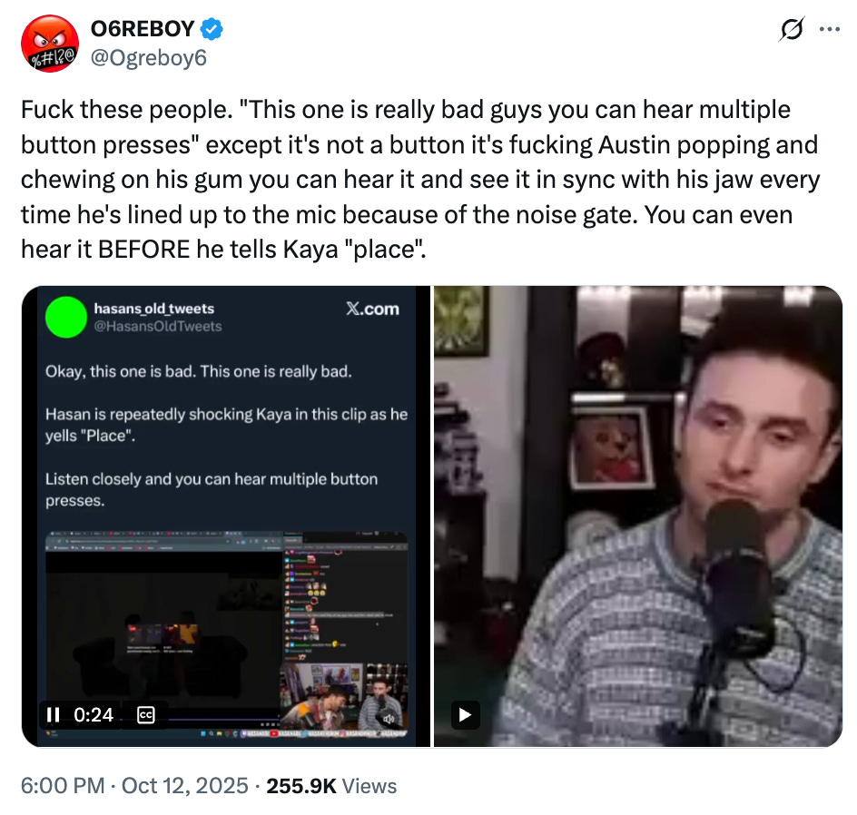 Any clip, no matter how benign, can be reframed in service of a particular narrative. For example, on Monday, thousands of X users falsely claimed that a sound made by Twitch streamer AustinShow snapping his gum, was actually Piker pressing some sort of secret shock button.