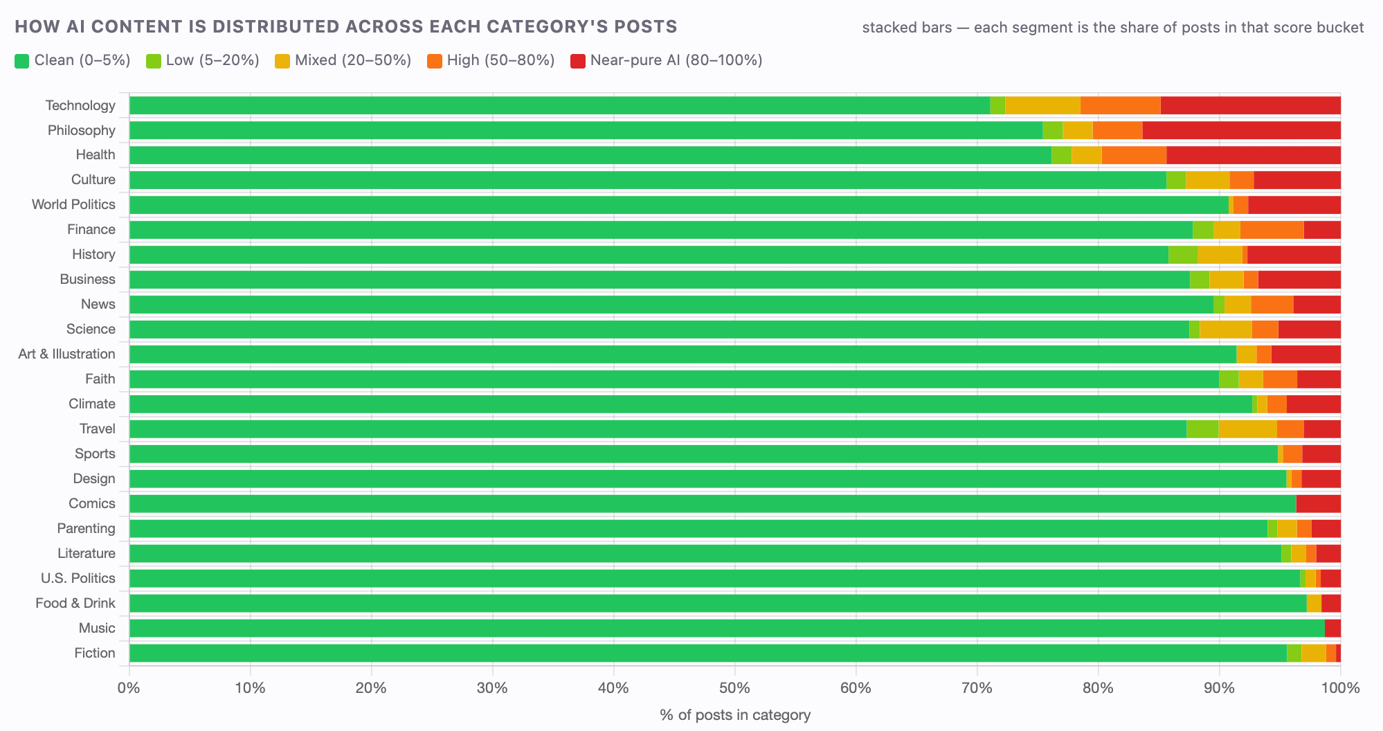 Other categories that contained high levels of AI writing were more concerning. 23% of top content in the Philosophy category and 22% of top content in the Health category is partially or fully AI generated. After that, the percentages drop precipitously. 13% of writing in Culture has been shaped by AI, and only 5% in sports, 3% in food and drink, and 1% in music, according to Pangram.