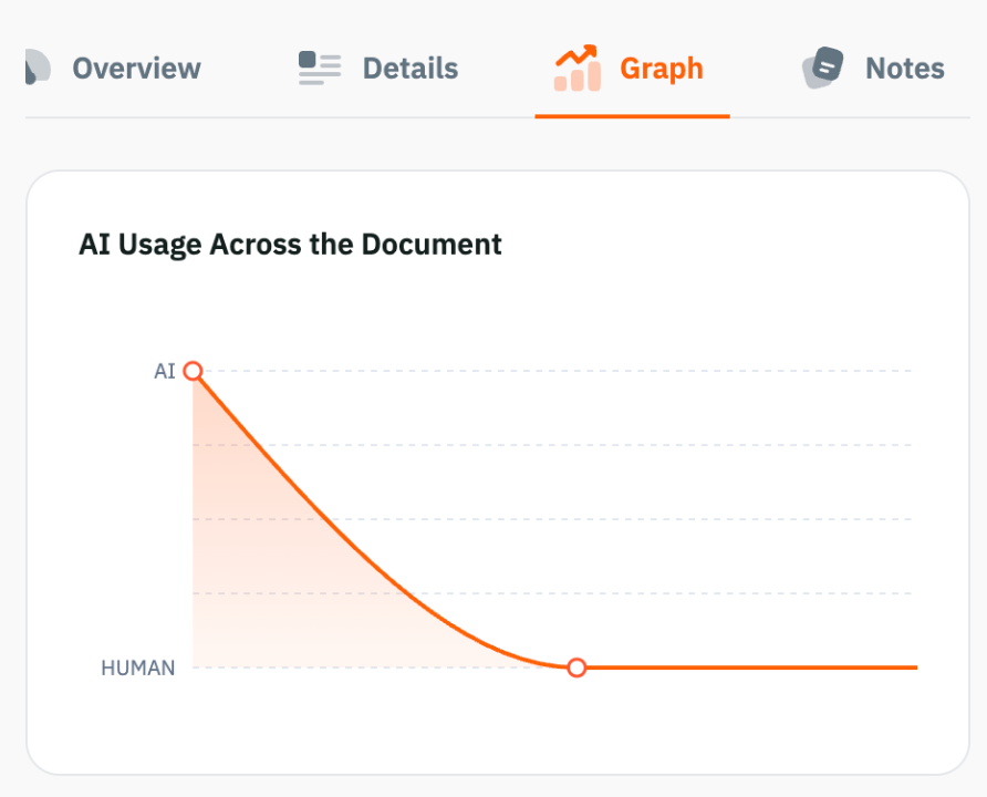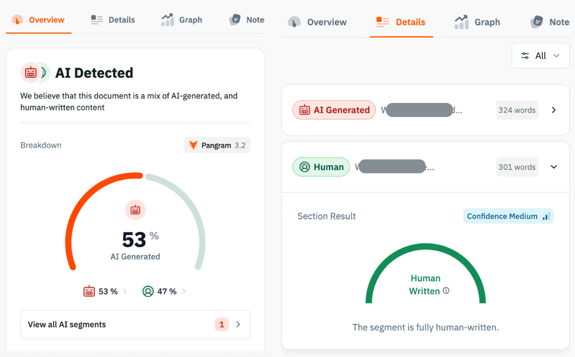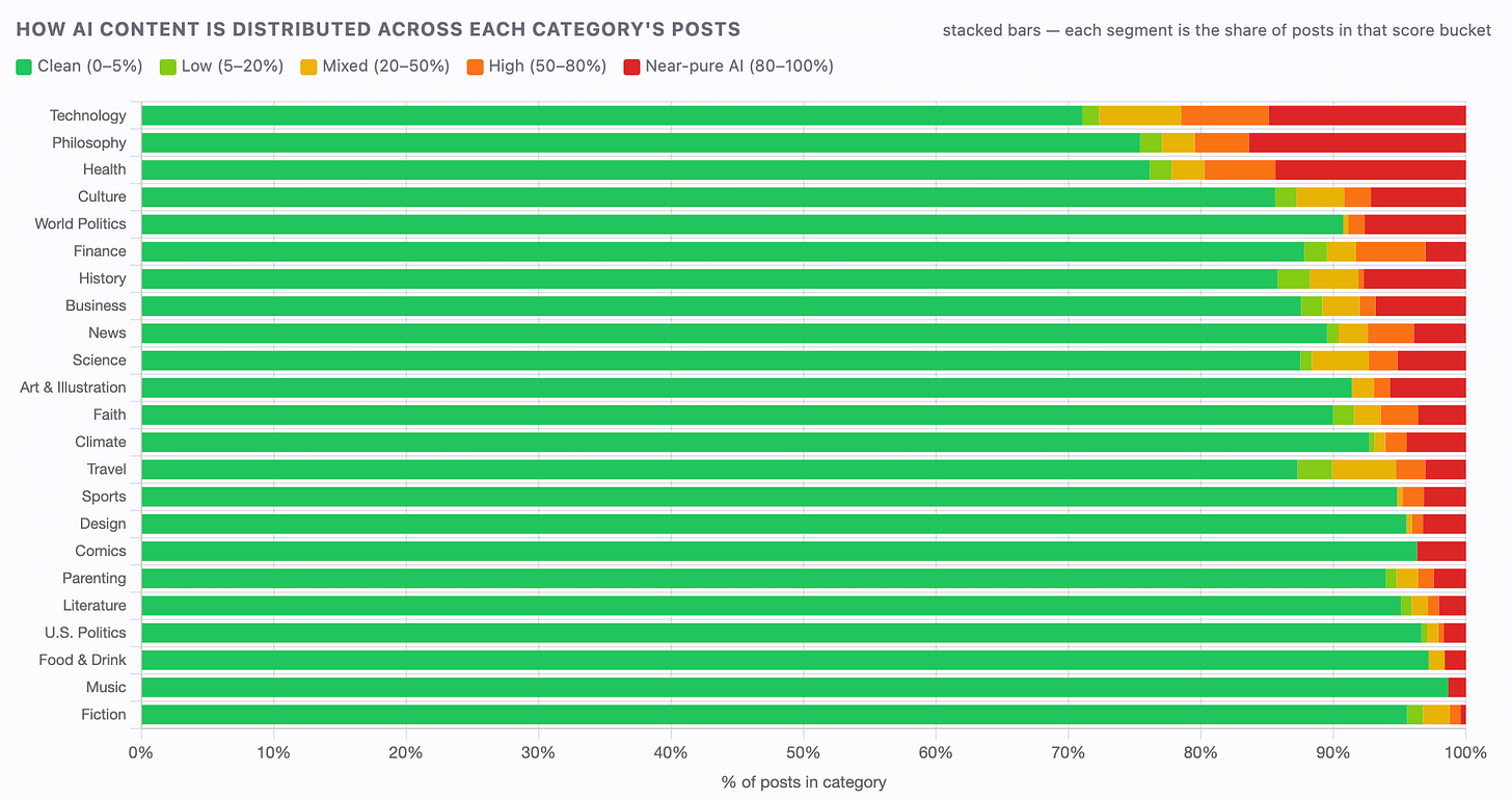As I scrolled through the data, I was surprised that some categories contained either low or high amounts of AI-generated content. I used Pangram’s Chrome extension to easily spot-check posts from publications across categories. While some posts were clearly 100% AI generated and some were fully human, Pangram also identifies a mix of human and AI-authored content within a single post. Pangram lets you scroll through a post as it highlights what text is likely AI-generated or contains signatures of AI-generated writing. The tool also provides a graph of AI usage across the document.