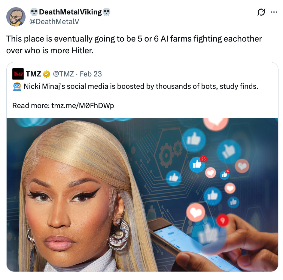 Nicki Minaj’s social media is being propped up by thousands of bots, one analysis found. MAGA internet quickly melted down in response and accused the POLITICO story of being some sort of Cardi B hit piece.