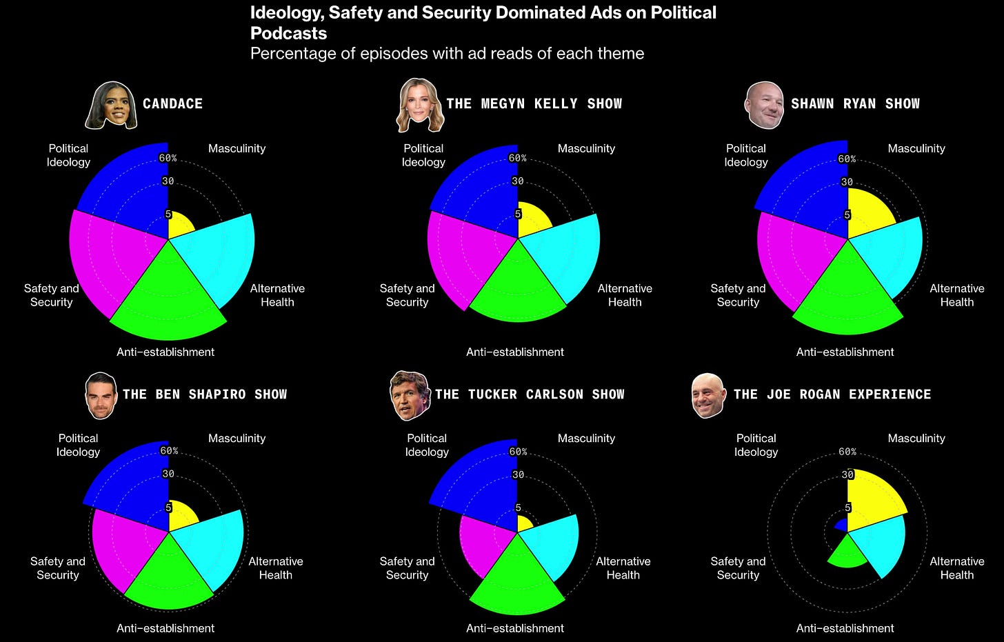 The entire Bloomberg investigation is worth reading. It digs into so many other aspects of the right-wing advertiser landscape and reports on specific brands and trends. I thought the MAHA section and portion of the report that talks about how much safety and security messaging dominated ads on popular podcasts was so fascinating.