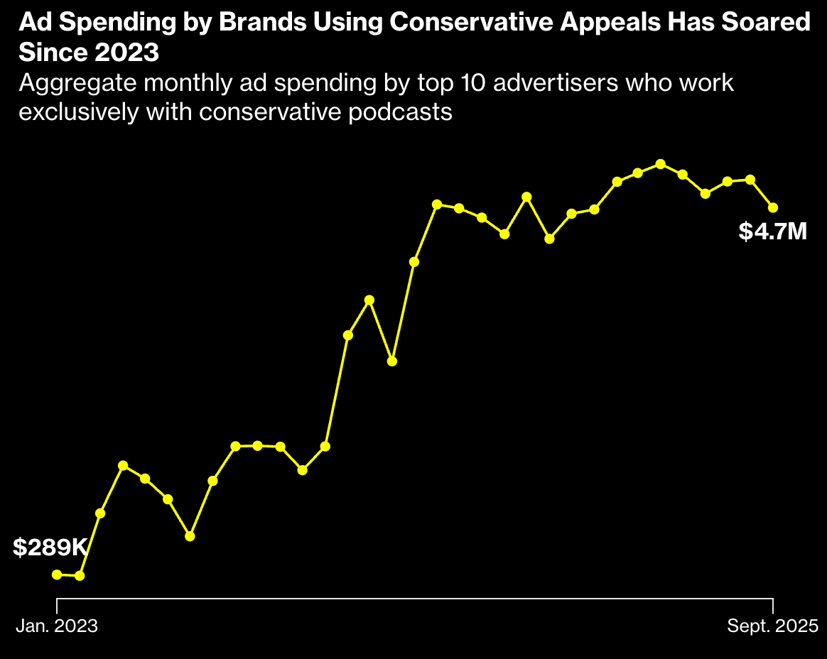 The top 10 advertisers spending the most on host-read ads on the right-leaning podcasts are investing nearly four times more per month in 2025 than they did on average in 2023. So far this year, those brands have collectively spent about $5 million a month on podcast advertising, according to Bloomberg’s analysis of Podscribe data.